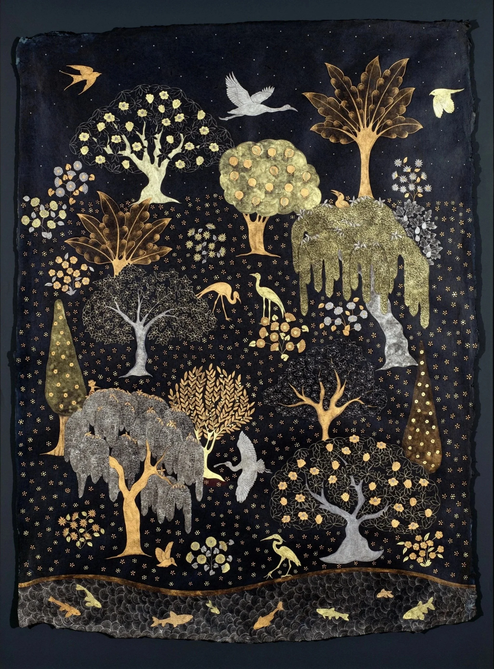 Ayeshia Gamiet’s Garden of Stars, shown at Jonathan Cooper during The Winter Show, is meticulously composed of handmade shell gold, palladium shell and indigo, on indigo stained hemp paper. I adore it’s contemporary take on elements of illuminated manuscripts, fantasy & folklore, and the natural world. And it’s just pretty.